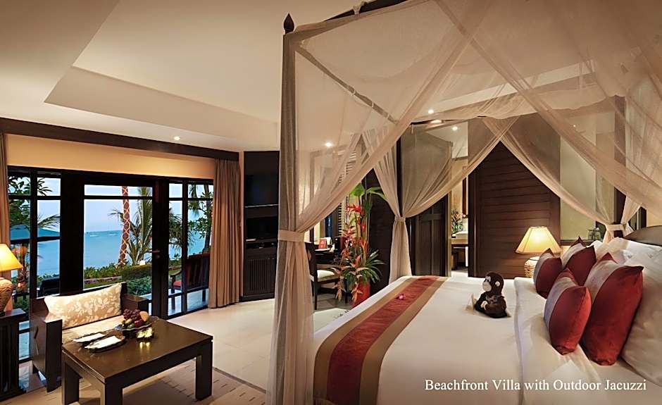 BEACHFRONT VILLA OUTDOOR JACUZZI is 2691 square feet and includes a double bed 131-150 width plus extra beds on demand, satellite tv , and bathrobes.