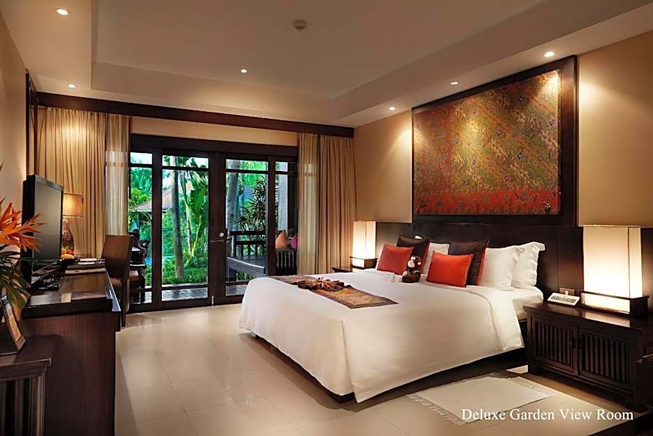 DELUXE ROOM GARDEN VIEW is 538 square feet and includes either a king-size bed 150-183 width or 2 single beds 80-130 width plus satellite tv and slippers.